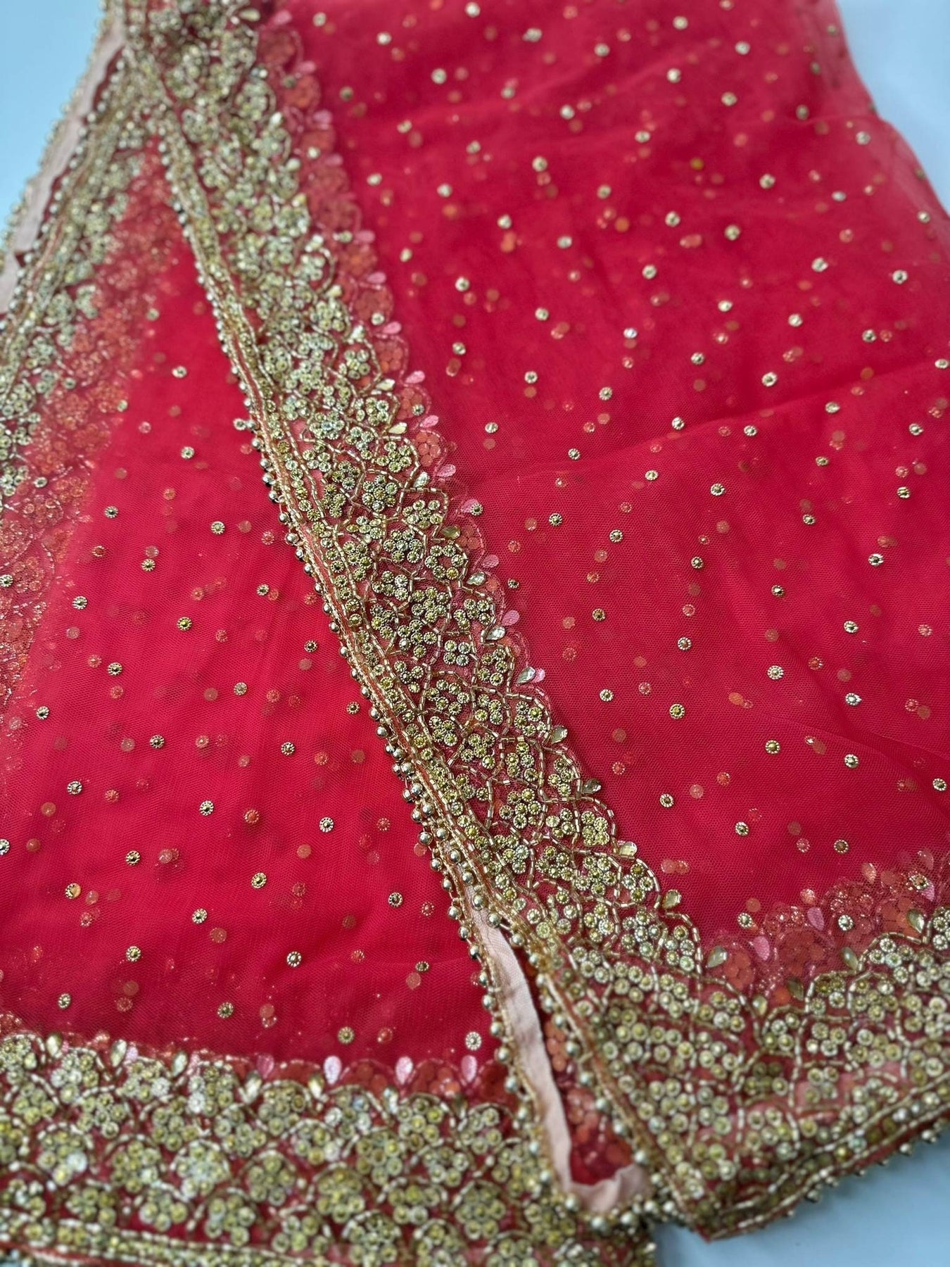 A rich red dupatta featuring elegant zari embroidery, crafted to add a royal and traditional touch to your bridal look.
