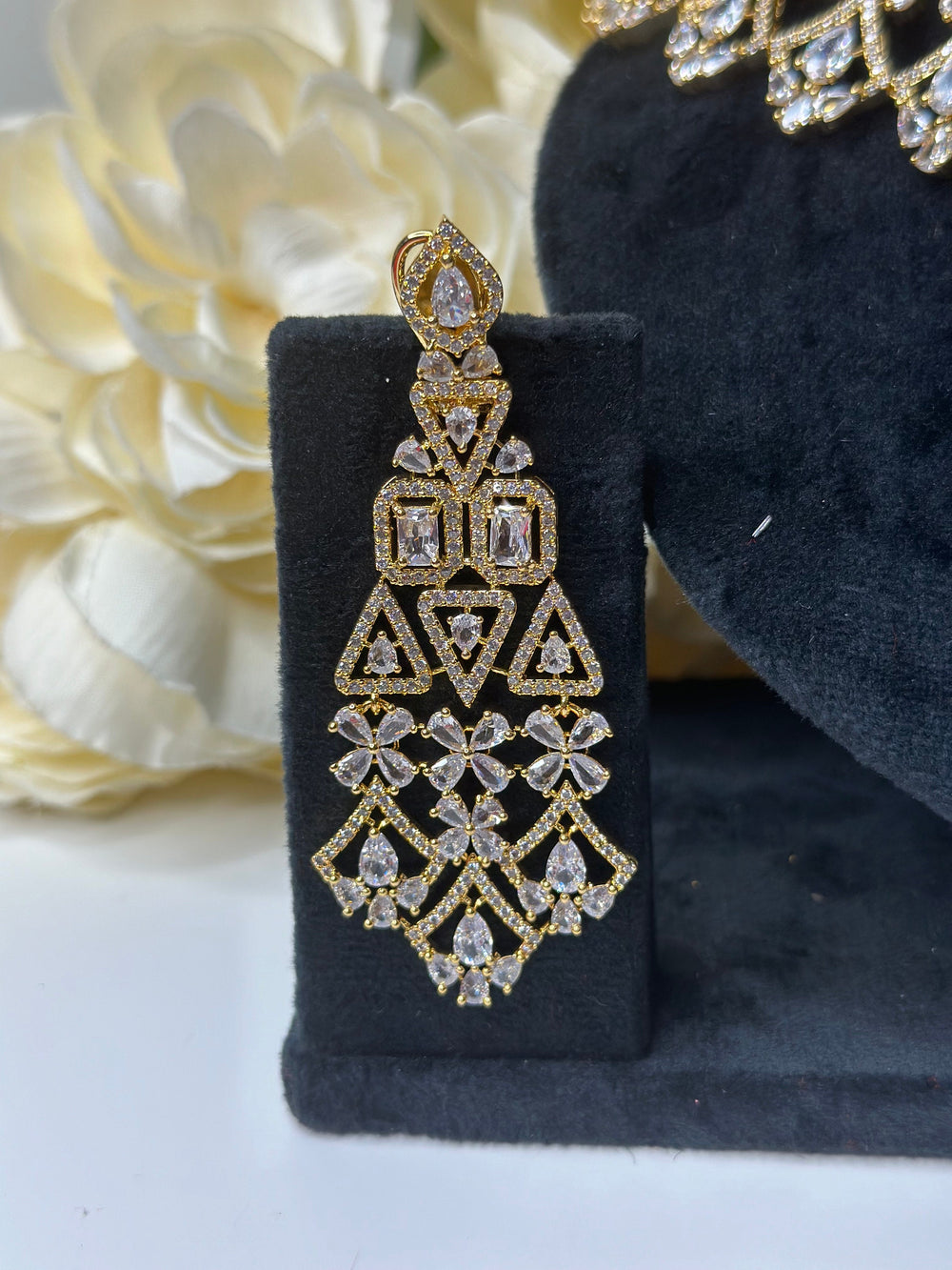 The Cali CZ Gold Necklace Set features sparkling stones with a gold finish for a classy and elegant look. It comes with matching earrings, perfect for weddings, parties, and festive occasions.