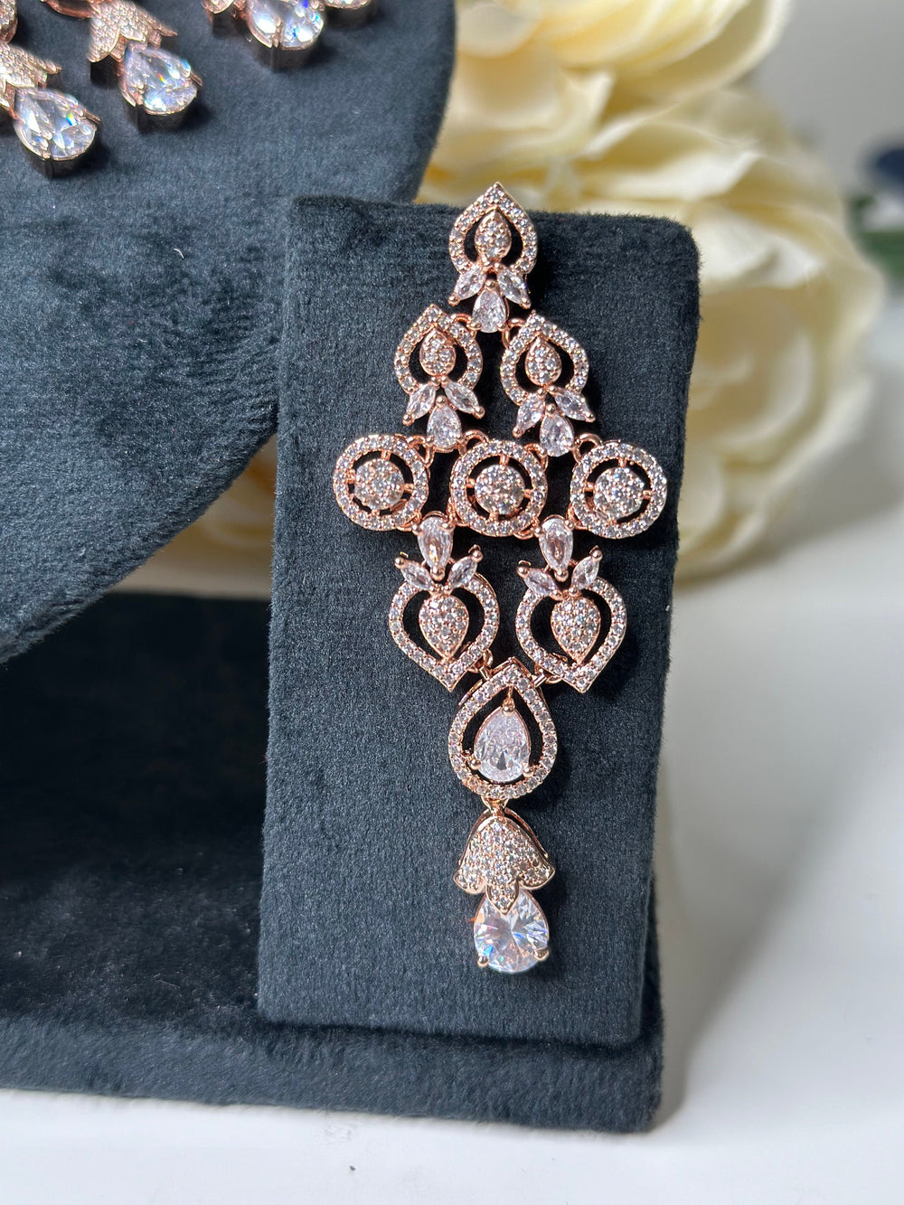 A luxurious Rose gold necklace and earring set adorned with intricate designs, shimmering stones, and teardrop-shaped pendants for a touch of royal elegance.