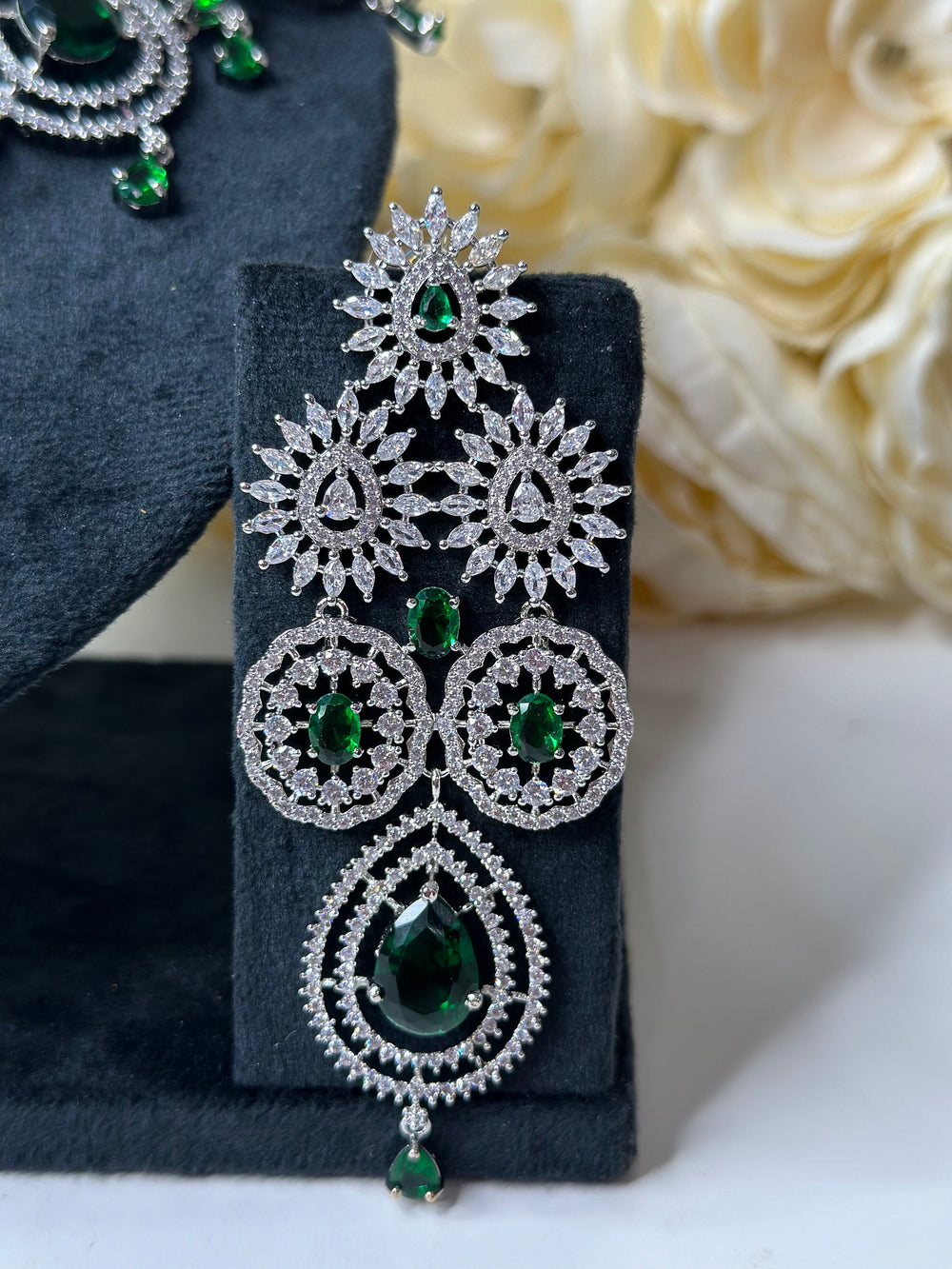 Exude regal charm with this intricately crafted silver choker set, embellished with dazzling diamonds and emerald green drops.