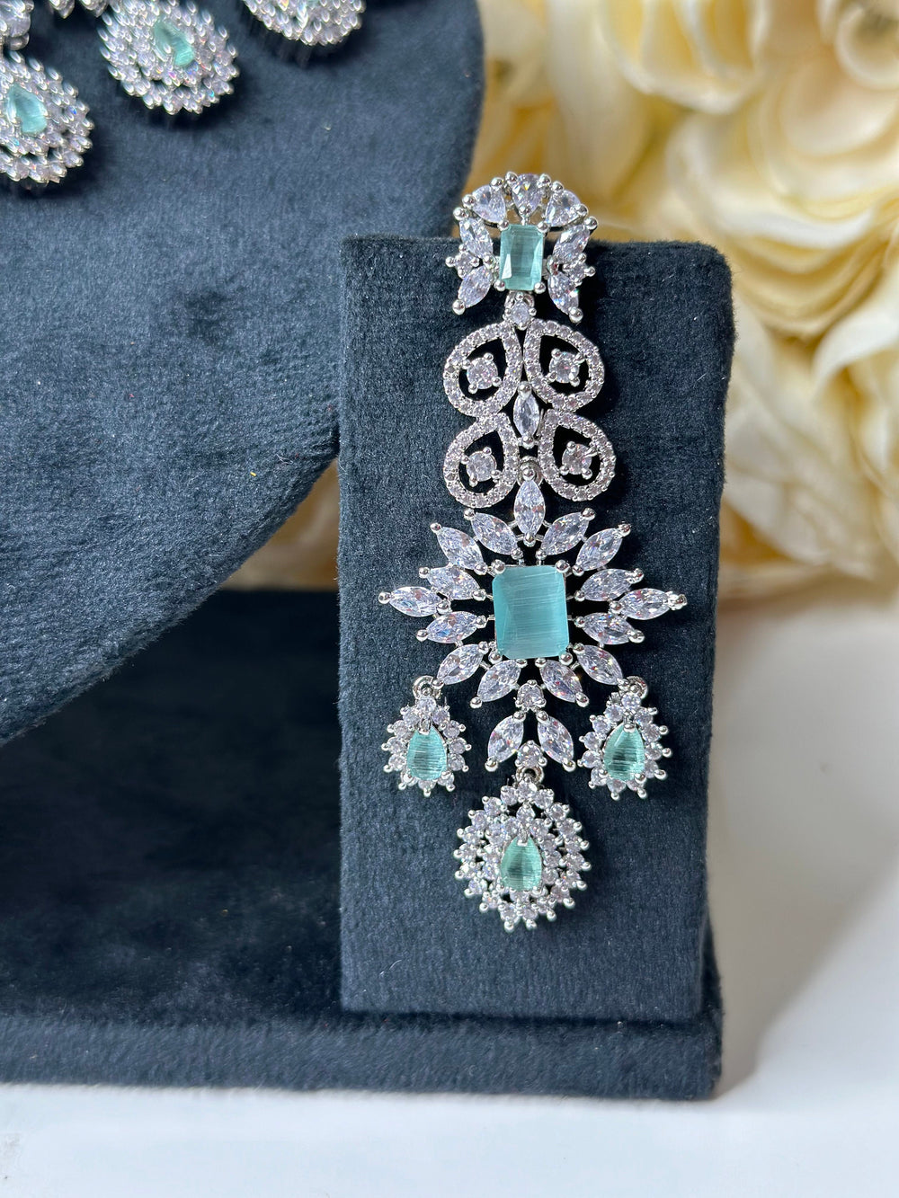 The Nova CZ Mint Necklace Set features soft mint-colored stones with a silver finish for a fresh and elegant look. It comes with matching earrings, perfect for weddings, parties, and festive occasions.
