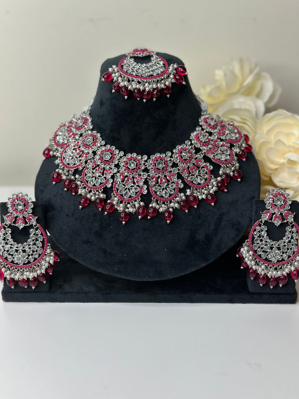 Beautiful Red Color Indian Polki Reverse AD Semi Bridal Set with Earring Tikka, Traditional Jewelry.