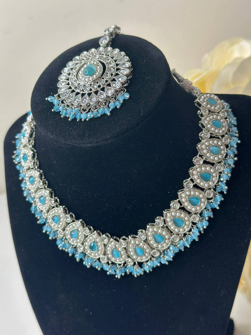 Beautiful Surf Color Indian Polki Reverse AD Semi Bridal Set with Earring Tikka, Traditional Jewelry.