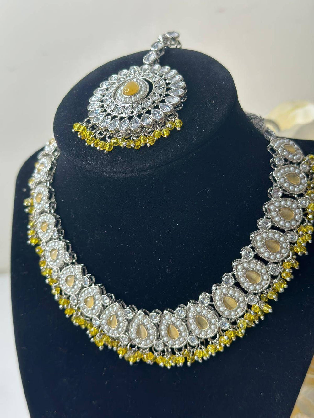 Beautiful Yellow Color Indian Polki Reverse AD Semi Bridal Set with Earring Tikka, Traditional Jewelry.