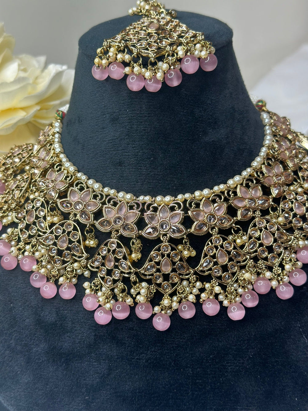 Antique gold artistry meets serene Baby Pink in this captivating necklace set.