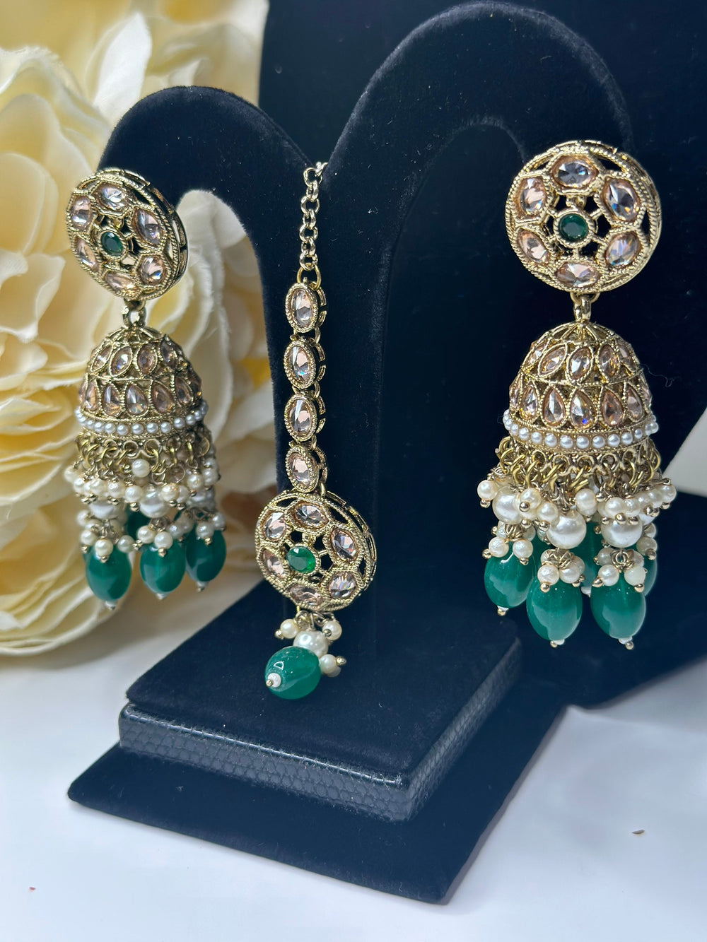 Beautiful Indian Green Color Polki Reverse AD Semi Bridal Set with Earring Tikka, Traditional Jewelry.