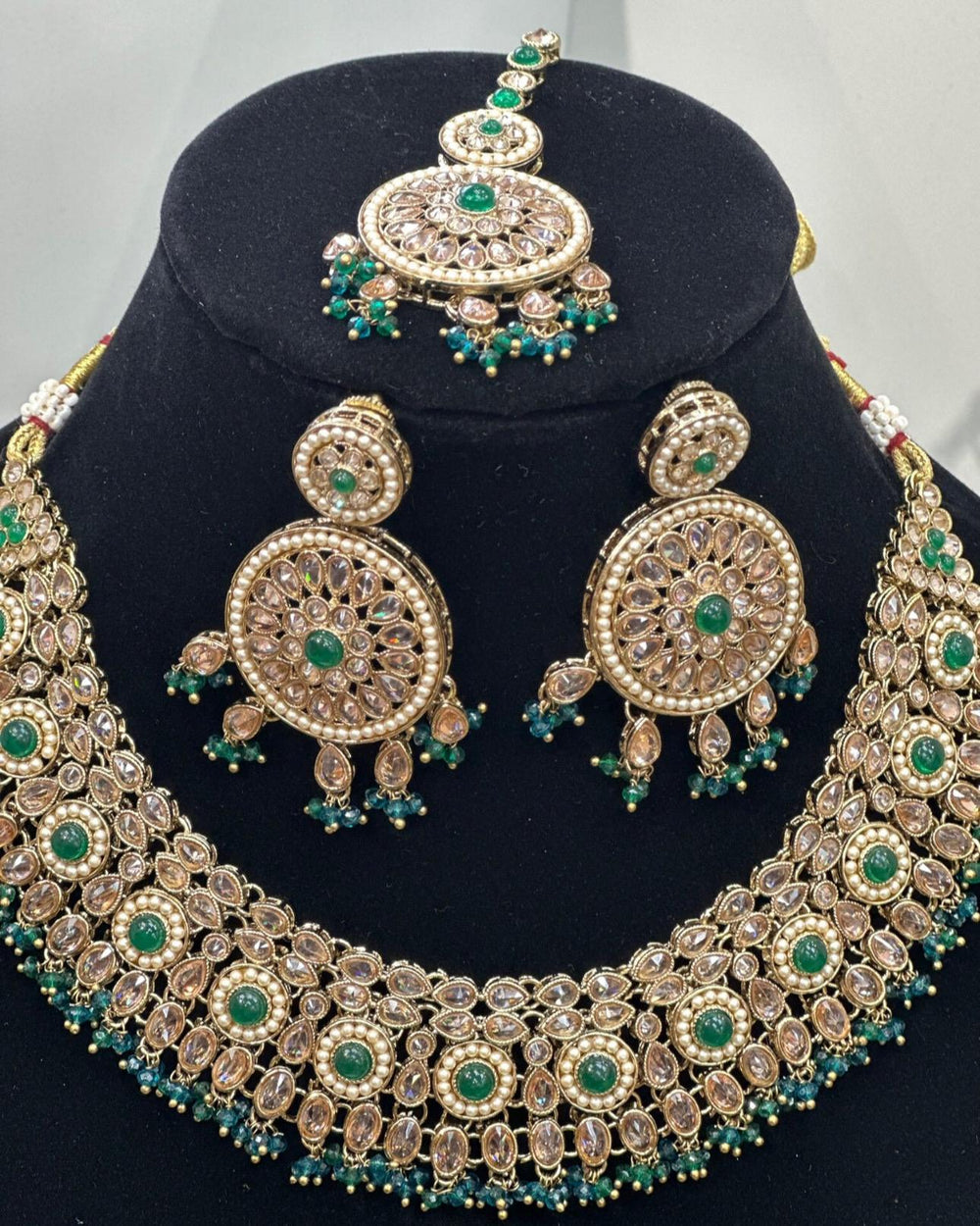 Beautiful Green Color Indian Reverse AD Semi Bridal Set with Earring Tikka, Traditional Jewelry.