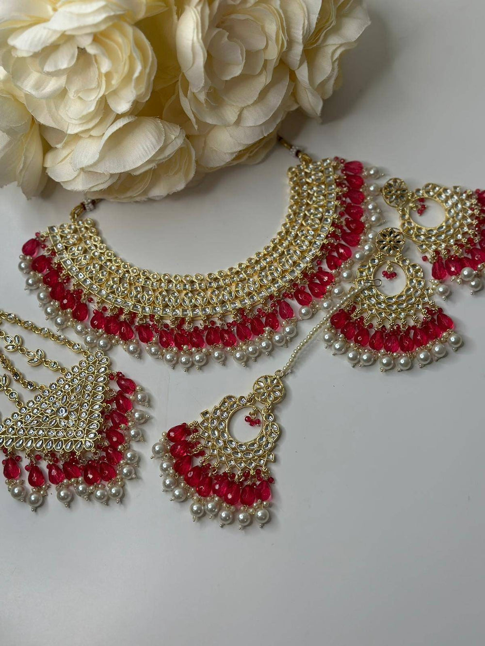 Beautiful Indian Red Color Polki Kundan with pearl work Bridal Set with Passa and Earring Tikka, Traditional Jewelry.