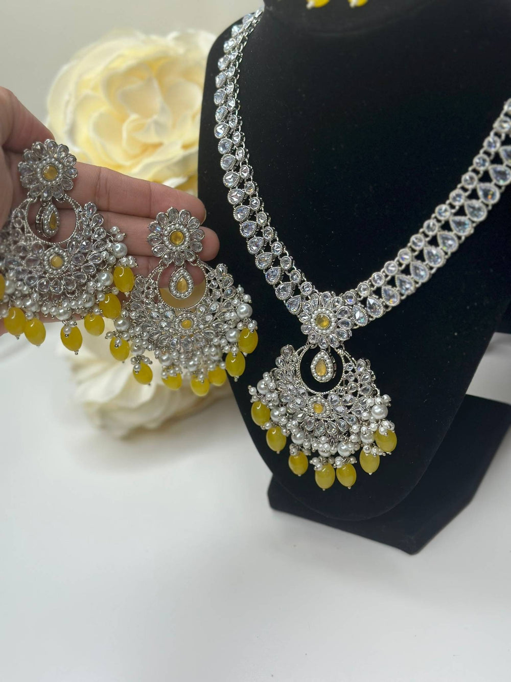 The Riya Reverse AD Yellow Long Necklace Set radiates warmth and grace with its sunny yellow stones. Complete with matching earrings and a maang tikka, it adds a bright and cheerful glow to your look.