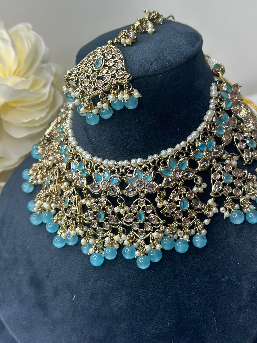Aditi Sky Blue Polki Reverse AD Necklace Set