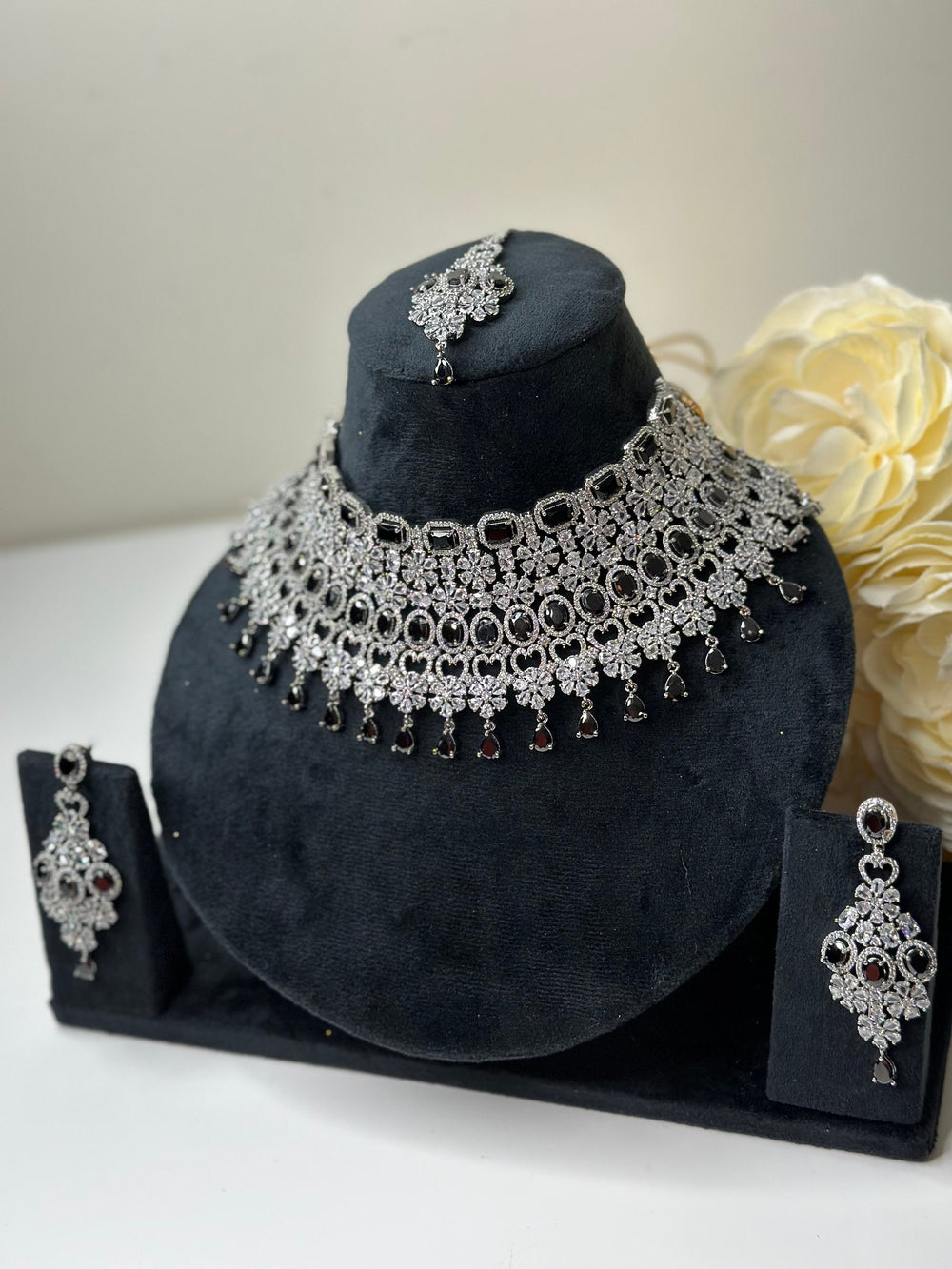 Elegant Ad jewelry set by Izhaar Designs with vibrant Black gemstones and clear crystals..