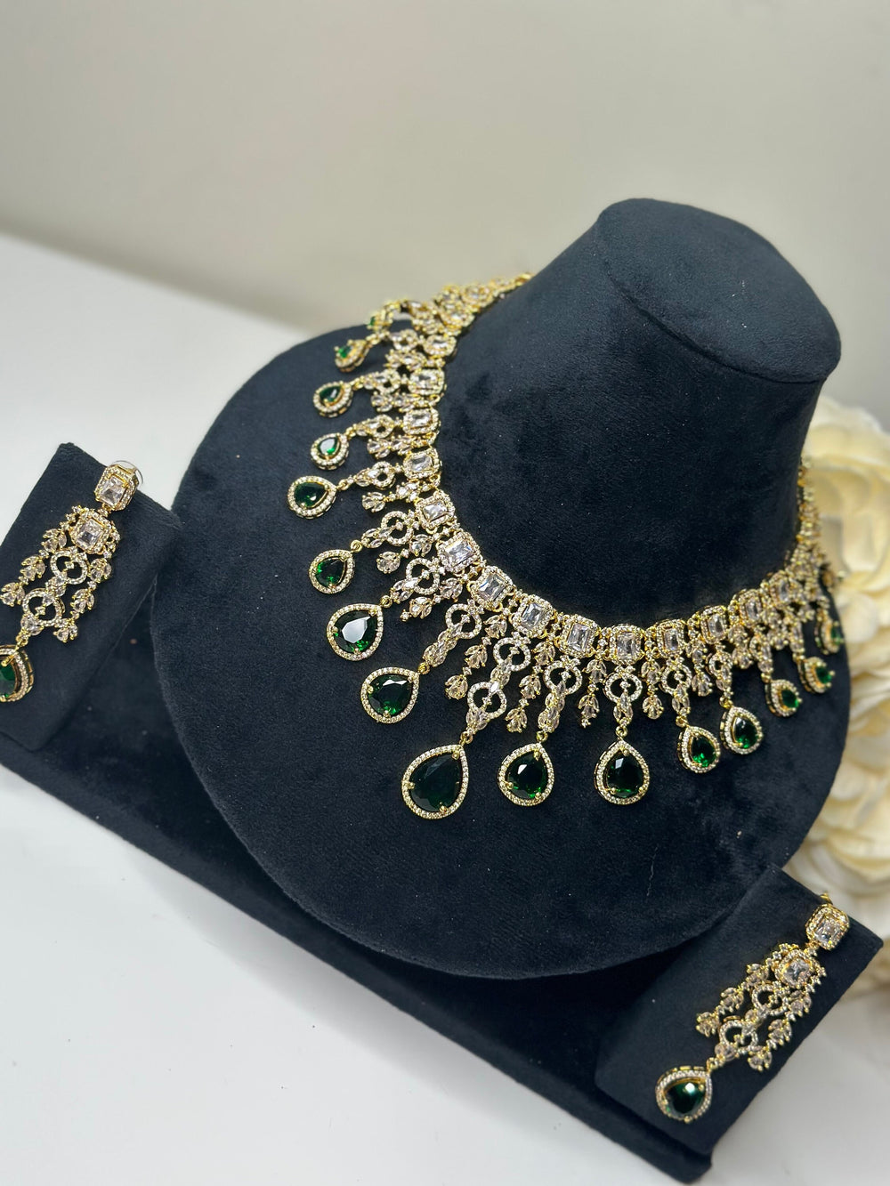 An elegant AD gold and green necklace with earrings for parties and weddings.
