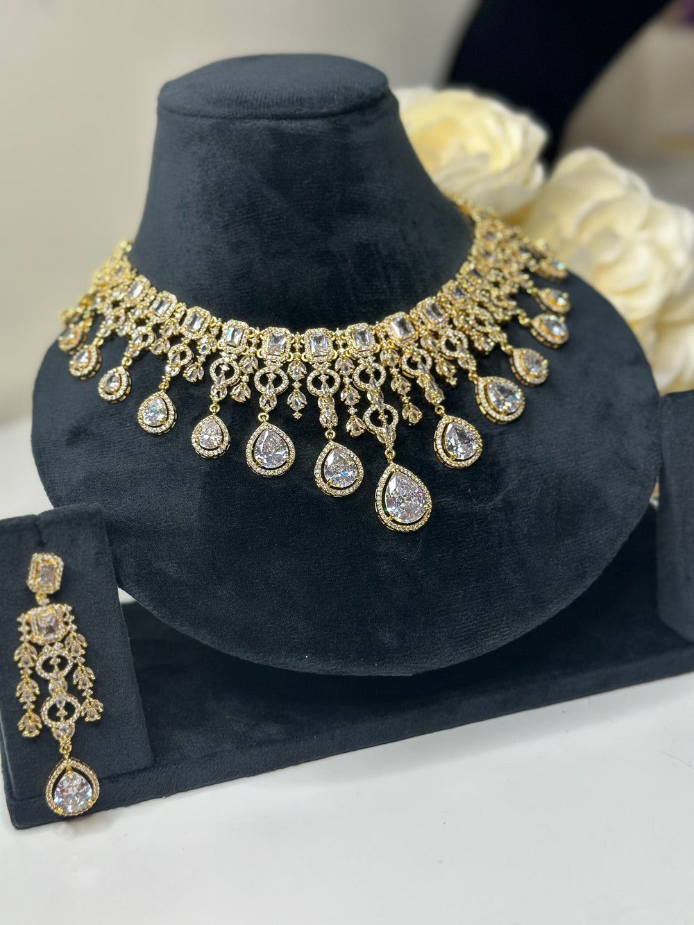 An elegant AD gold Necklace with earrings for parties and weddings.