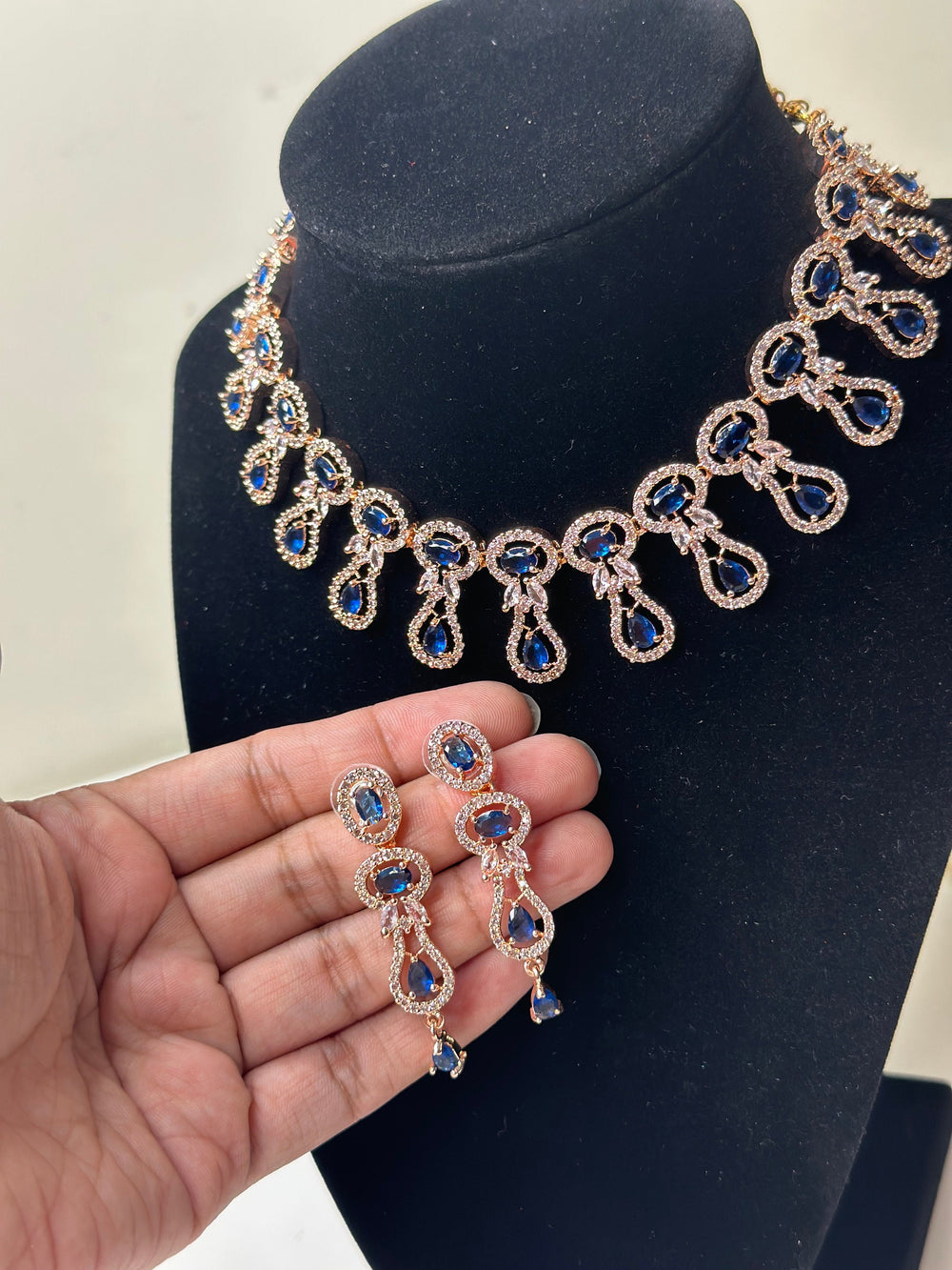 An elegant CZ Rose Gold and Blue stone necklace with earrings for parties and weddings.