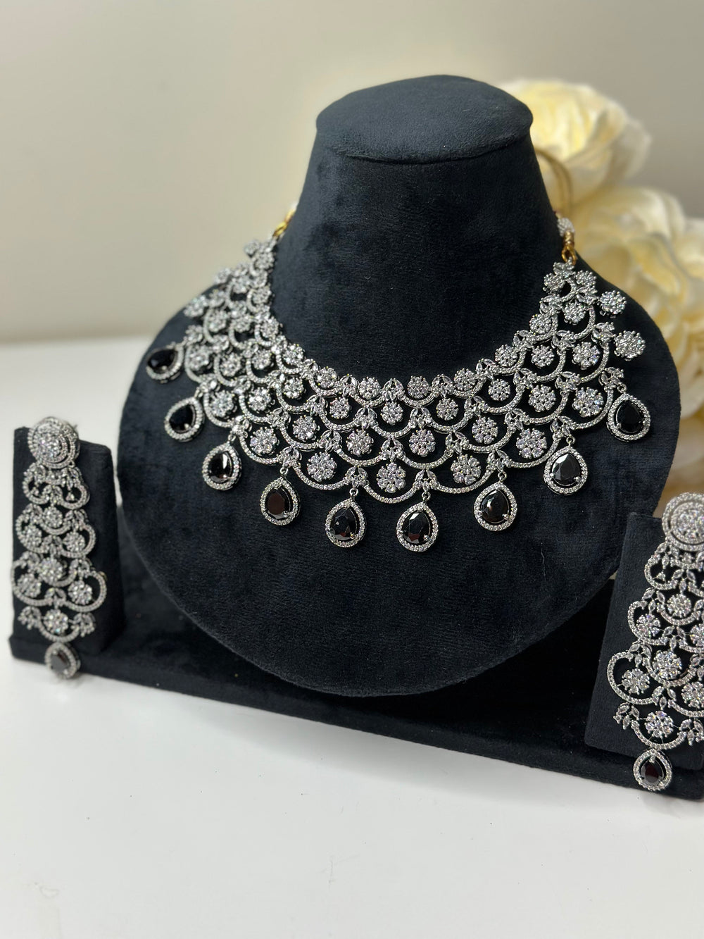 An elegant AD Black Necklace with earrings for parties and weddings.
