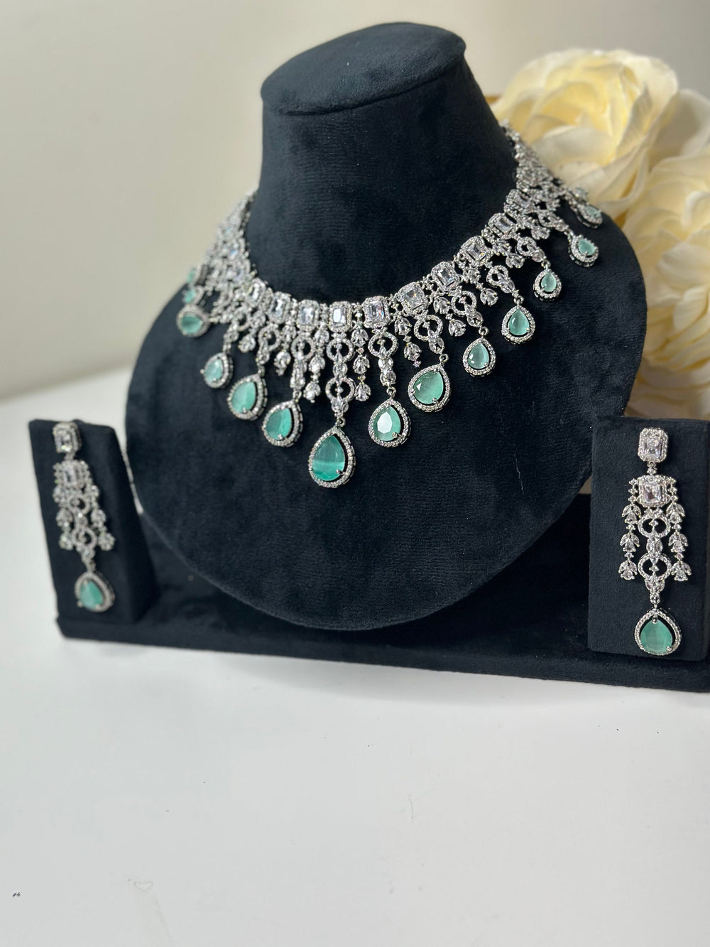 An elegant AD silver mint Necklace with earrings for parties and weddings.