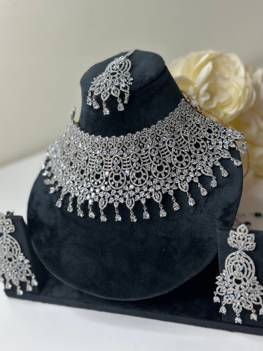 An elegant AD silver Necklace with earrings for parties and weddings.Lightweight and elegant