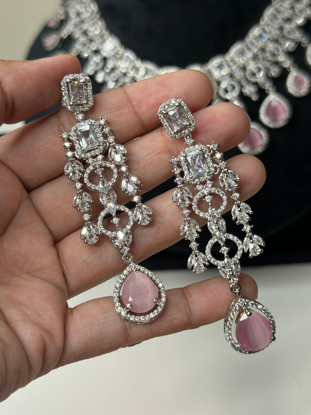 An elegant AD silver pink Necklace with earrings for parties and weddings.