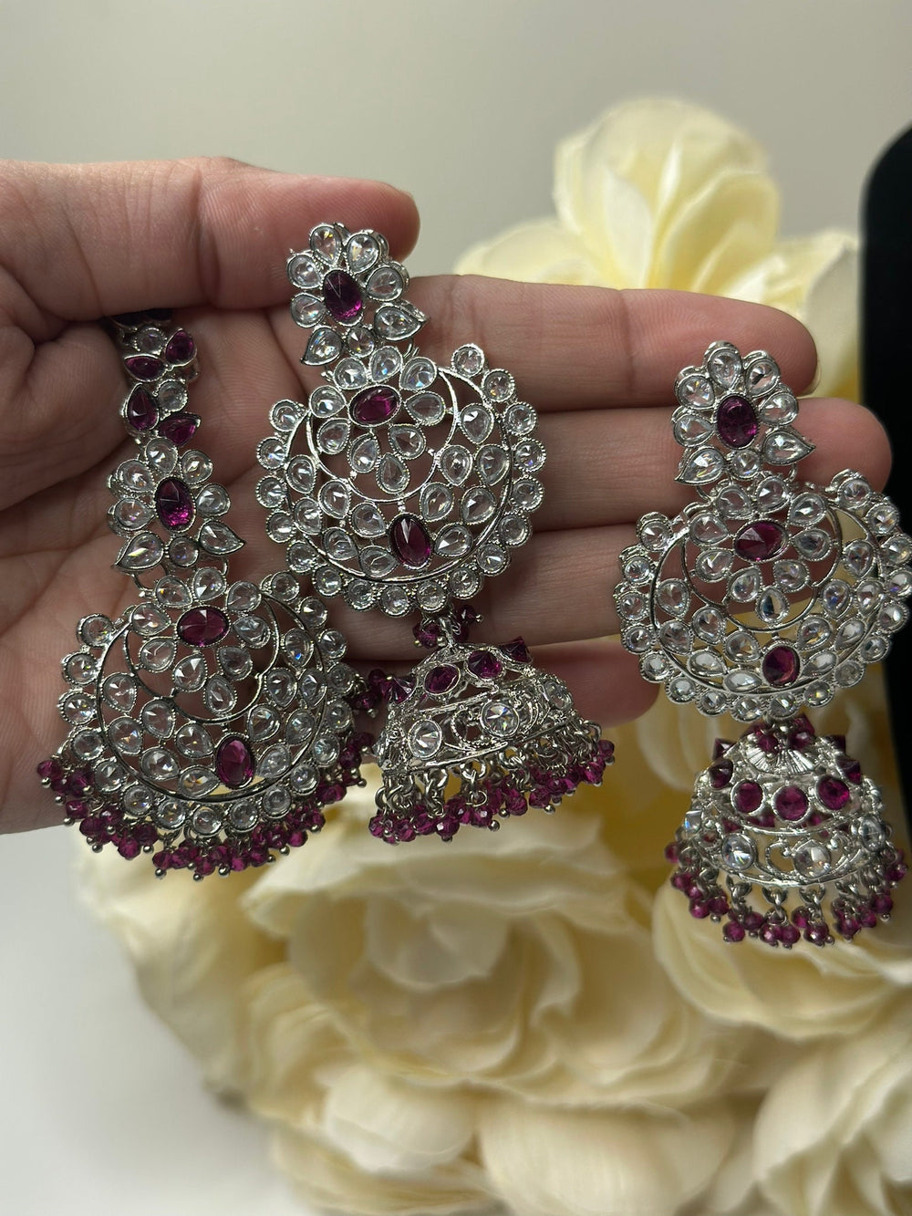 Elevate your elegance with this luxurious Polki Reverse AD set featuring stunning statement earrings, and a matching maang tikka - a perfect blend of traditional charm and modern sparkle.