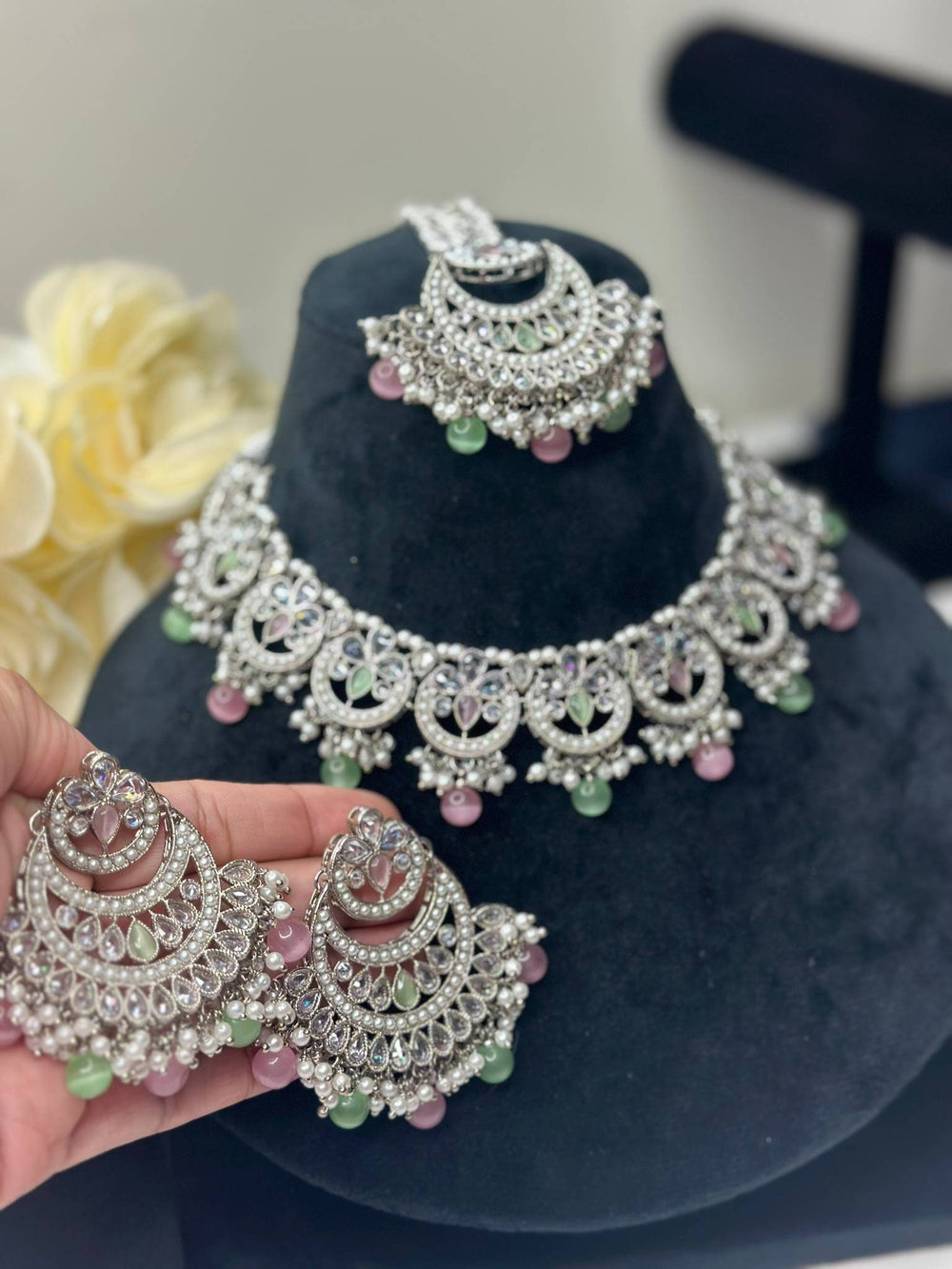 Beautiful Indian Multi Color Polki Reverse AD Semi Bridal Set with Earring Tikka, Traditional Jewelry.
