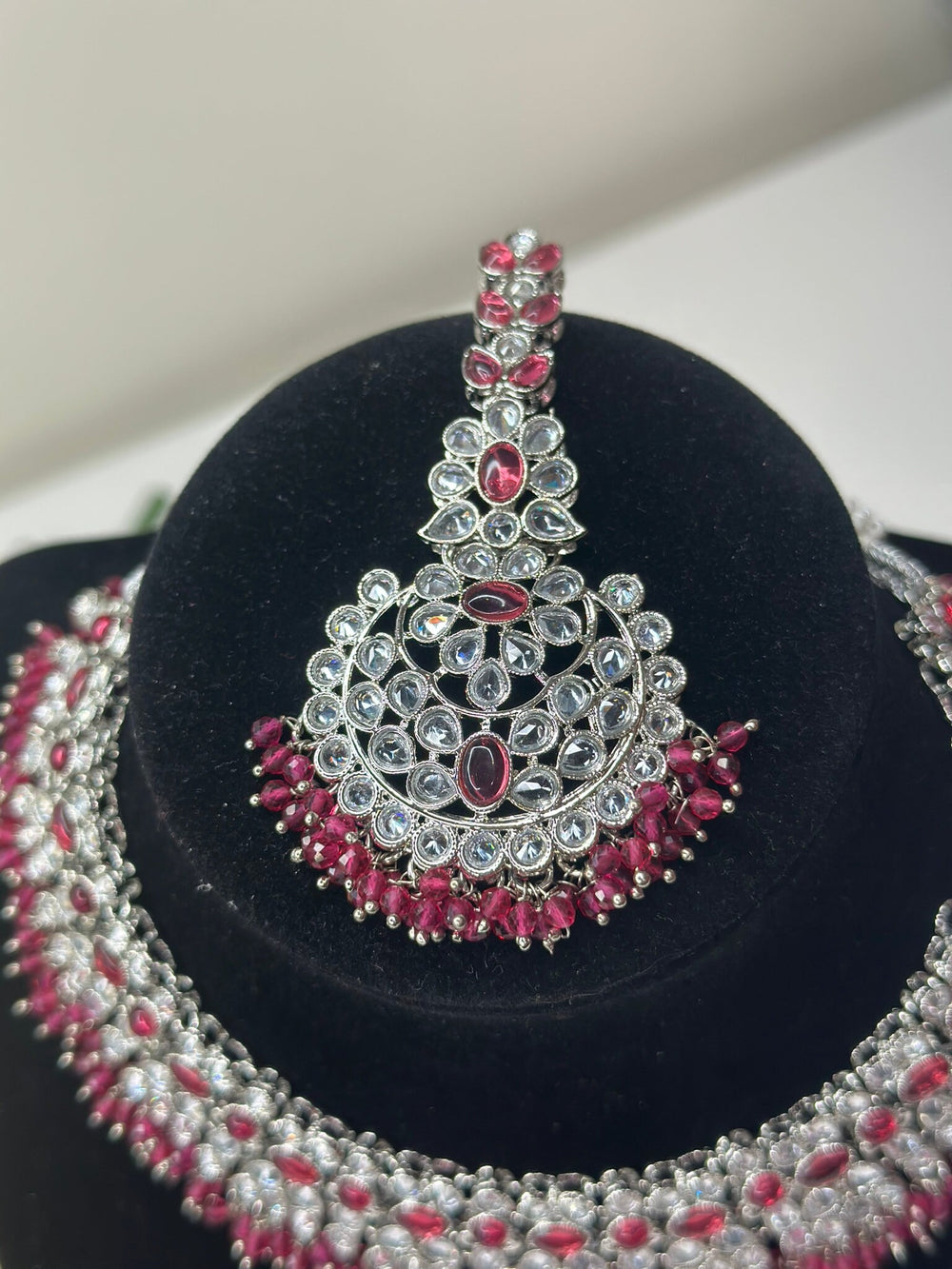 Elevate your elegance with this luxurious Polki Reverse AD set featuring a stunningstatement earrings, and a matching maang tikka - a perfect blend of traditional charm and modern sparkle.