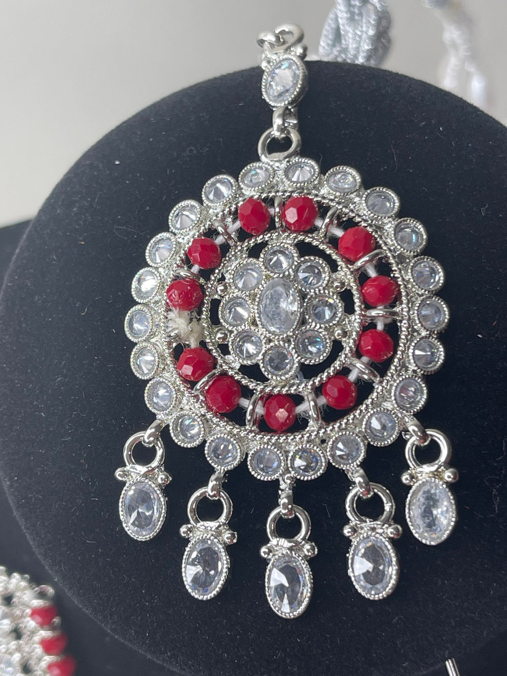 Beautiful Indian Red Reverse AD with pearl work, Semi-Bridal Set featuring Earring Tikka, Traditional Jewelry.