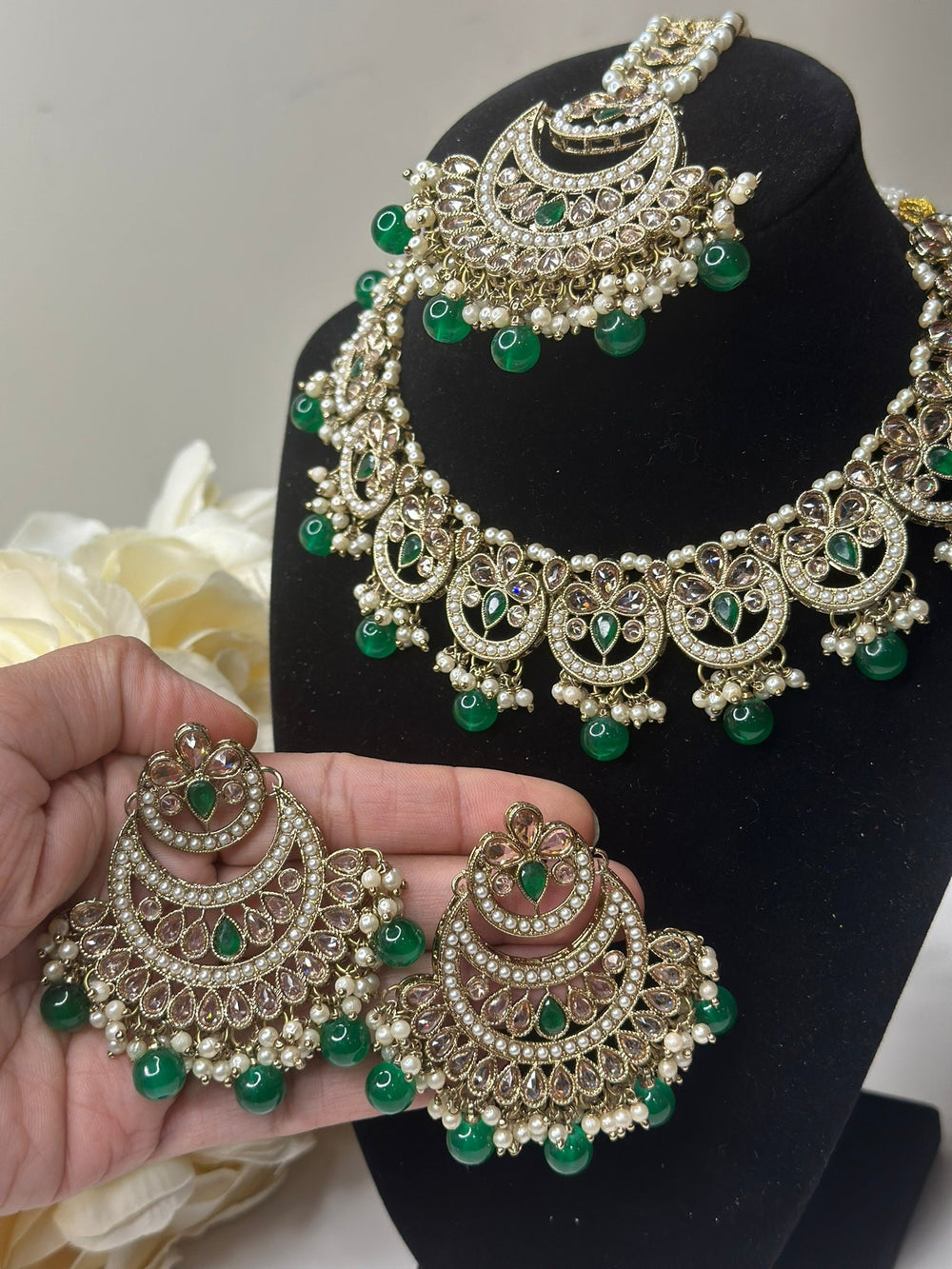Beautiful Indian Green Color Polki Reverse AD Semi Bridal Set with Earring Tikka, Traditional Jewelry.