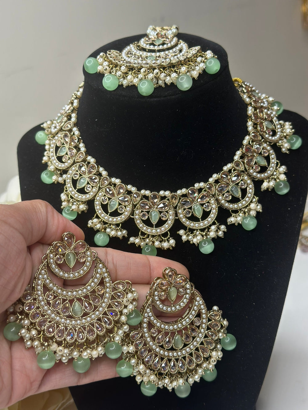 Beautiful L. Green Color Indian Polki Reverse AD Semi Bridal Set with Earring Tikka, Traditional Jewelry.