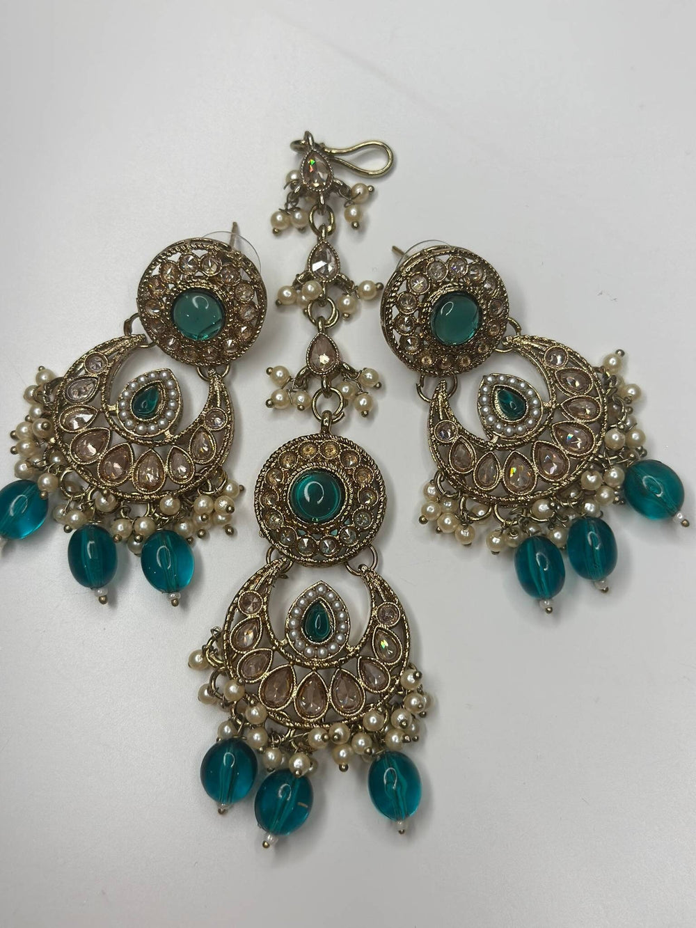Beautiful Indian Radium Color with silver Polish Polki Reverse AD Set with Earring Tikka, Traditional Jewelry.