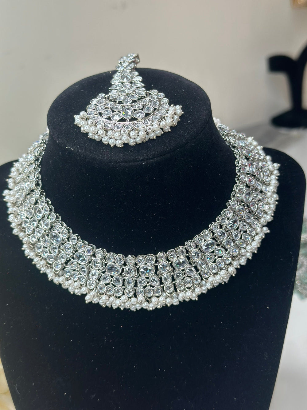 Beautiful Indian Silver Color Polki Reverse AD Semi Bridal Set with Earring Tikka, Traditional Jewelry.
